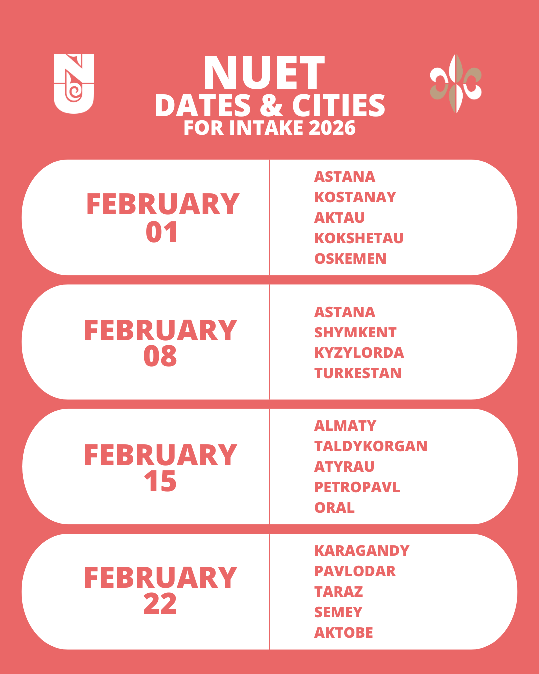 The Nazarbayev University Entrance Test (NUET) will be held in cities across Kazakhstan from 1 to 22 February 2026. This is the first step in your journey toward admission to NU.