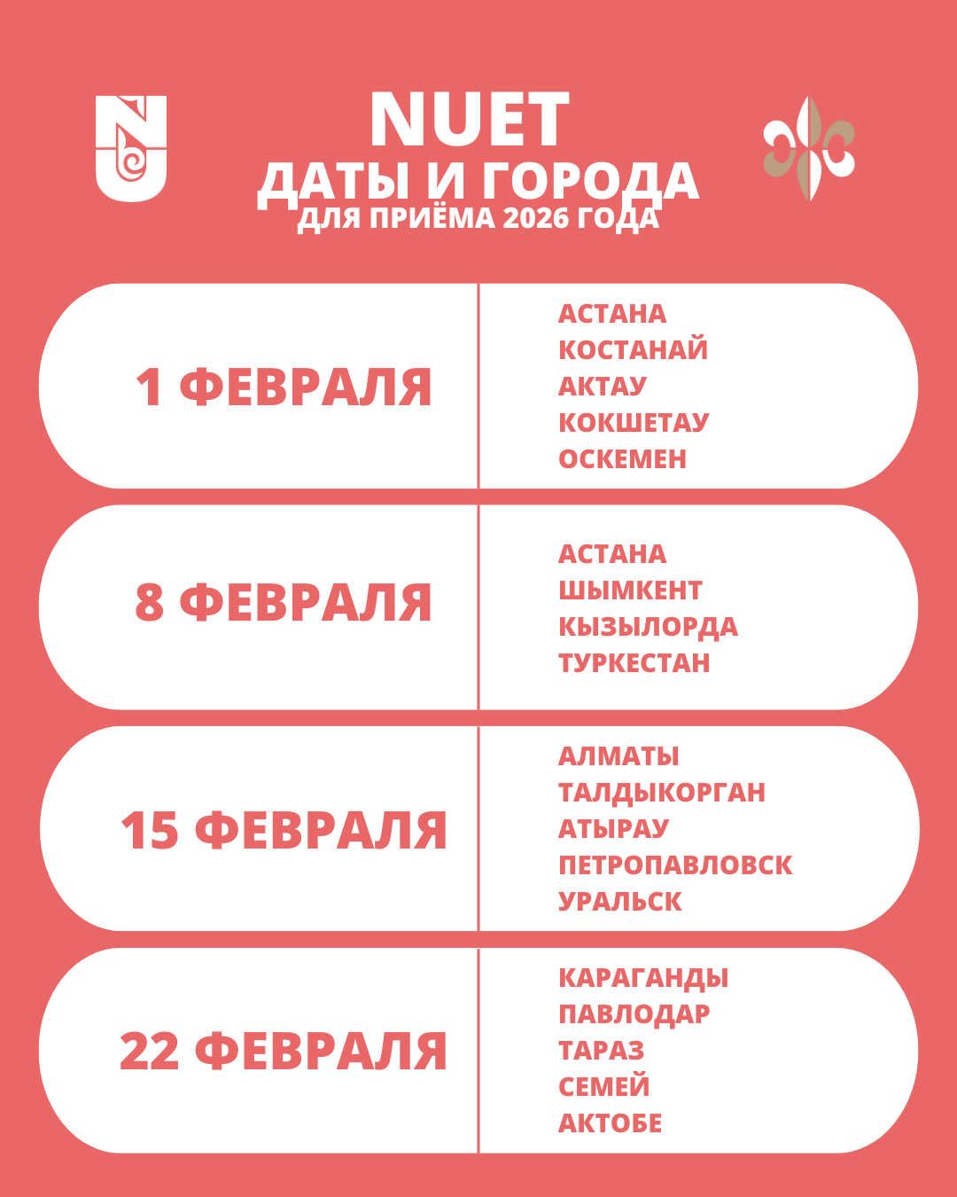 Вступительный тест Назарбаев Университета (NUET) будет проводиться в городах Казахстана с 1 по 22 февраля 2026 года.